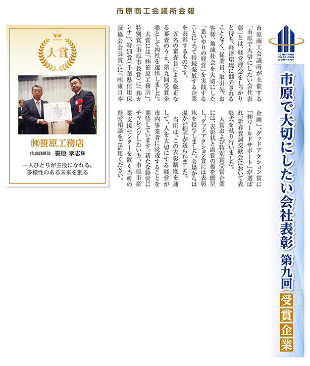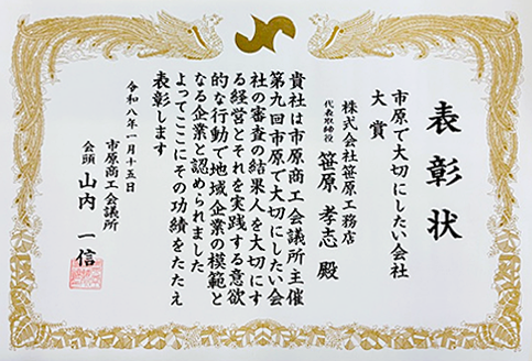 当社は市原商工会議所主催「第9回市原で大切にしたい会社表彰」 におきまして、大賞を受賞いたしましたのでご報告申し上げます。